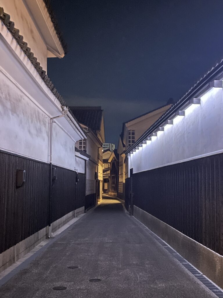 食後に、美観地区を散策。白壁の家々が続く景観は、夜もステキです。