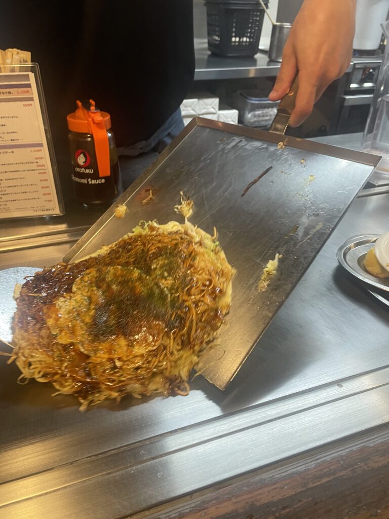 橋を渡り、対岸からも橋を眺めたりしてから、市内に移動してホテルにチェックインし、夕食に出かけます。明日の夕食は広島で友人とフレンチなので、今日は岩国ですが広島焼きを食べようということになり、食べログ100名店の「そば玉や」へ。おすすめの「そば肉玉」の広島焼きをビールと一緒に美味しくいただきました。