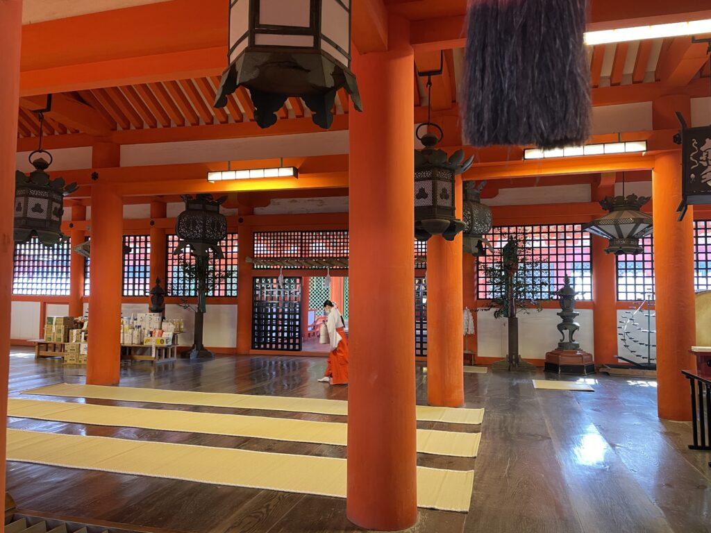 厳島神社の本殿に入ります。赤い柱が映えます。
