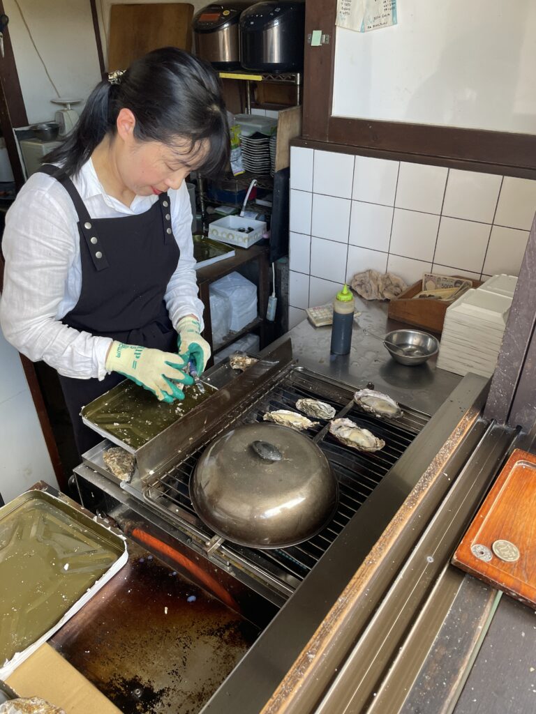 厳島神社の近くで焼き牡蠣を販売していたので、食べてみます。お姉さんが1人で手際よく牡蠣を開いて焼いています。醤油やレモンなどを使わない、ただ焼いただけの牡蠣が無茶苦茶美味いです。