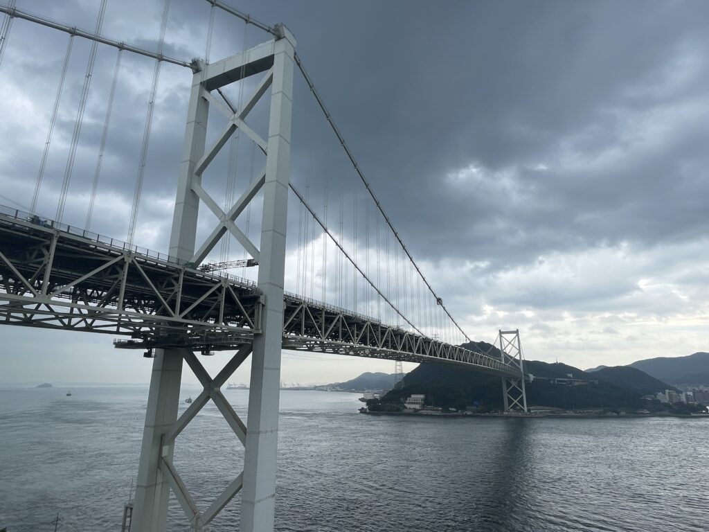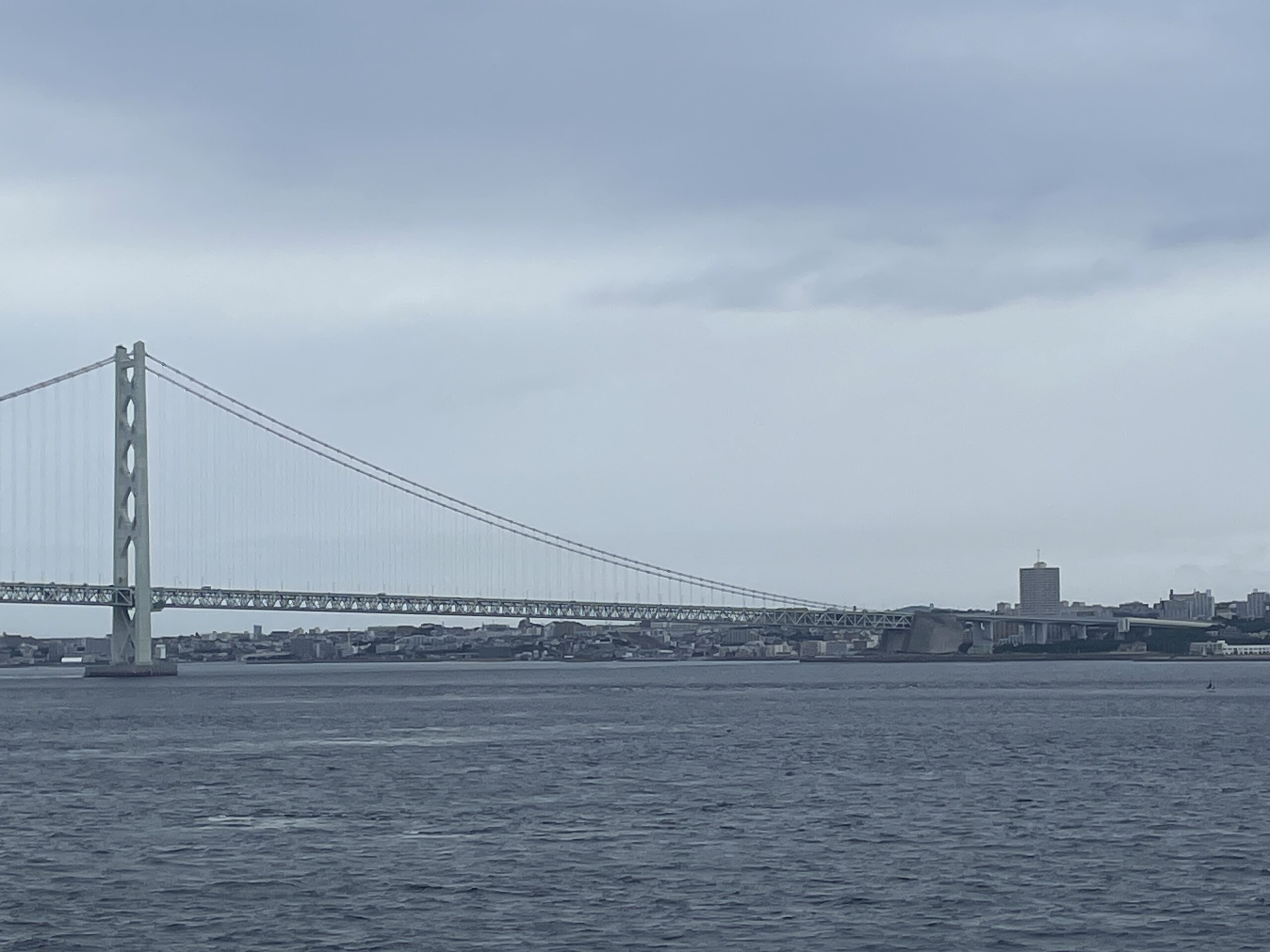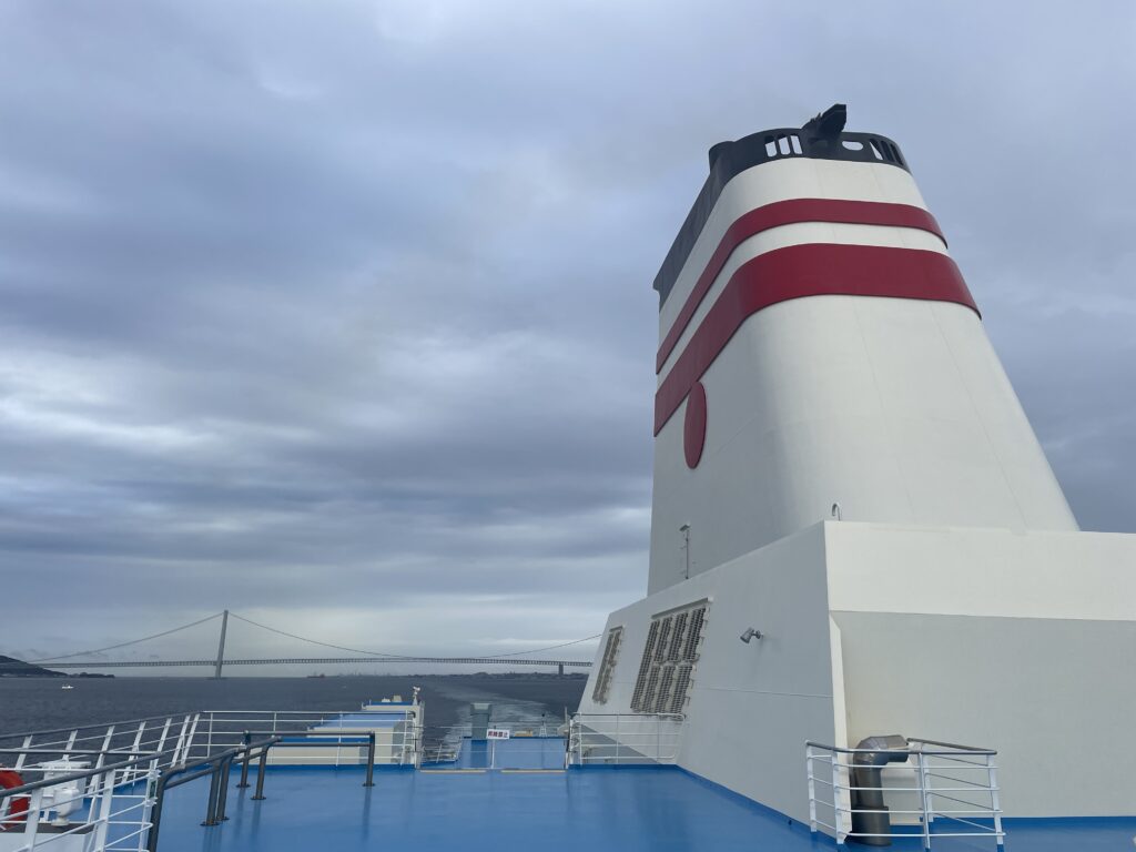 出港時は、既に夜なので街の明かりが少し見える程度で、船室からの景色は楽しめませんが、翌朝起きると瀬戸内海の素敵な風景が見えます。予定より少し遅れて7時20分ごろに明石大橋を通過するので、展望デッキに見に行きました。17日前に車で通った橋を下から眺めます。