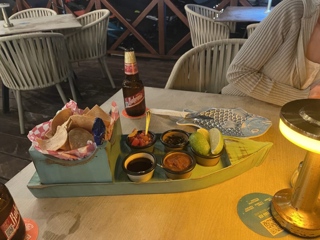 スムーズにチェックインを終えて荷物を部屋に入れ、夕食へ出かけます。あらかじめ目星をつけていたホテルから徒歩約7分の「El Fish Fritanga」という店に行きました。少し時間が遅いので、軽めにイカのリング揚げ、チキンシーザーサラダとビールを注文。するとトルティーヤチップスが舟盛りで出てきました。