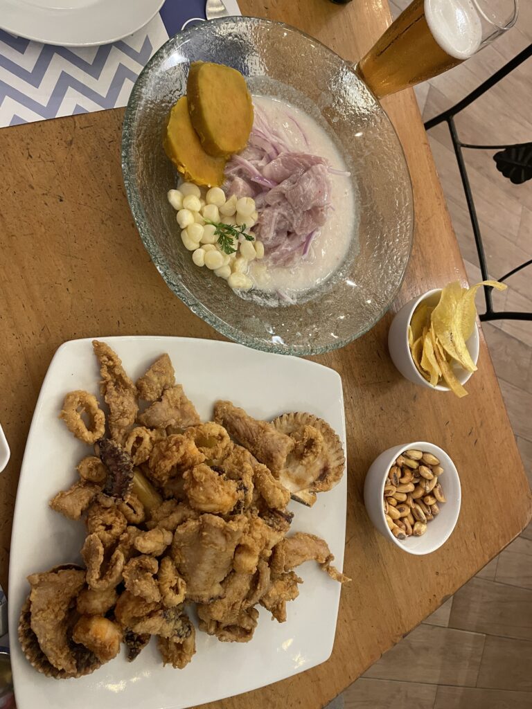夕食はミラフローレンス地区の「Punto Azul」へ行き、魚のセビーチェとミックスシーフードフライ、ビールを注文。ようやく辿り着いた本格シーフード。かなり美味いです!味付けがソフトで、素材の味が生きています。ボリューム満点で、セビーチェの魚肉などはおそらく300g以上あります。