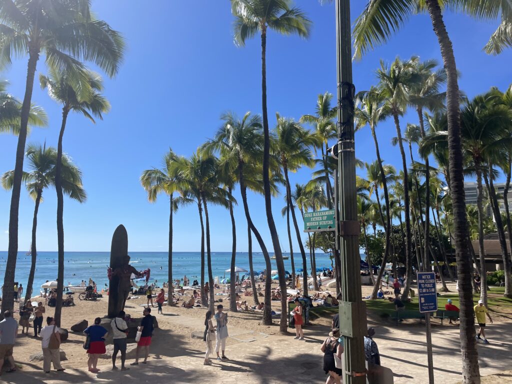 部屋にチェックインして荷物を置き、JCBカードで無料で乗れるピンクラインのトロリーバスに乗って、街の中心部へ向かいます。天気はイマイチですがハワイは大好きで、6年ぶり8回目の来訪になりますが、ワクワクします。