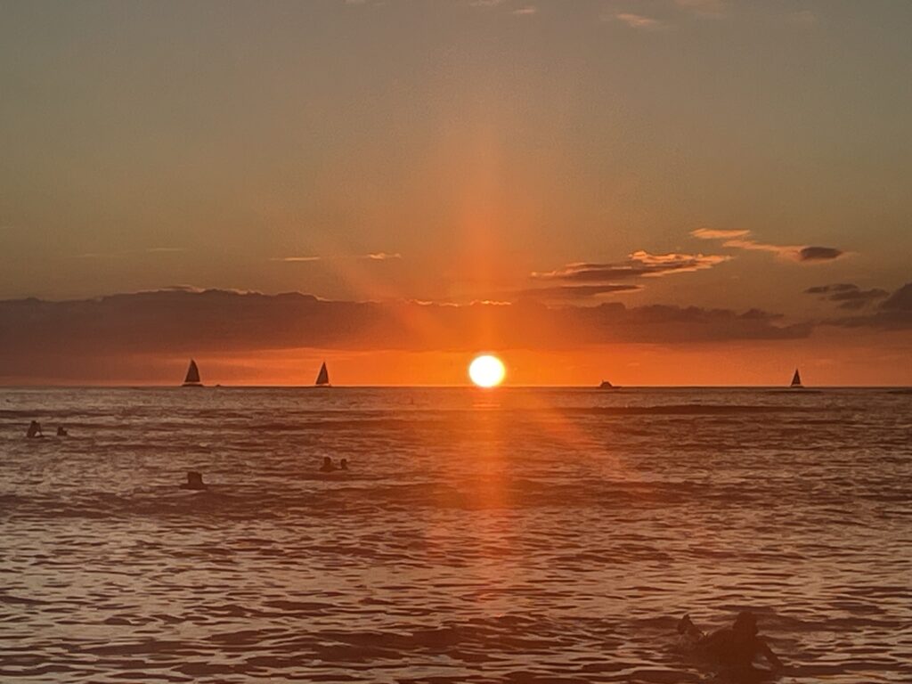 ちょうど日没時間になったので、ビーチに行って夕陽を見ます。太平洋に沈む夕陽が美しいです。