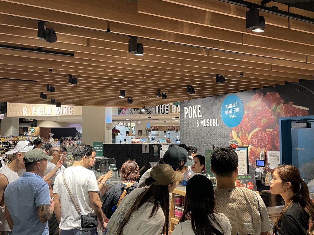 ビーチで朝寝してから一旦ホテルに戻り、着替えてからアラモアナショッピングセンターへ。まず1Fの「Foodland Firms」へ行きポキ丼を購入します。すごい賑わいです。