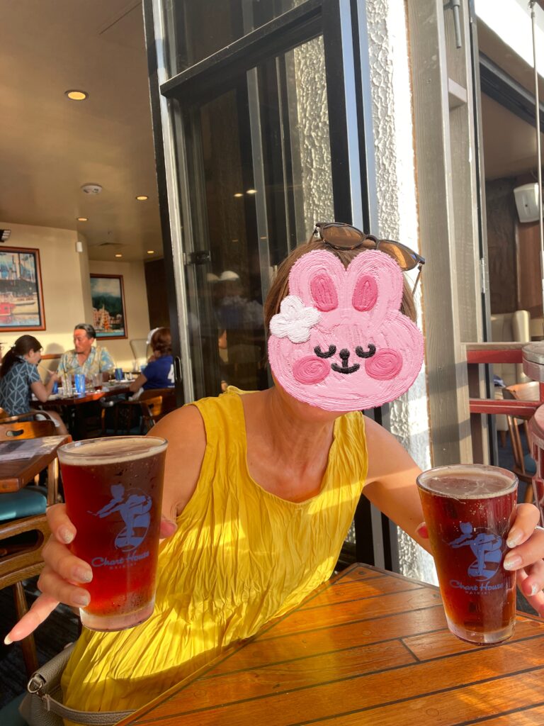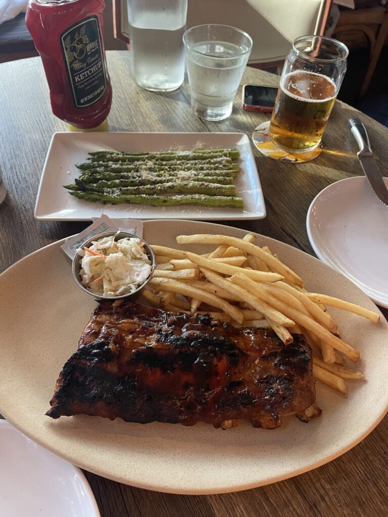 先輩から「物価の高いハワイではハッピーアワーを活用すると良いよ」と教えてもらっていたので、夕食はハッピーアワー時間に「ファイヤーグリル」へ。スペアリブとアスパラガス、ビールと白ワインを美味しくいただきました。