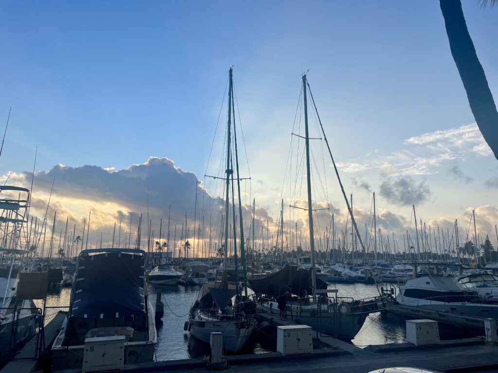 外へ出ると結構雨が降ったようで水たまりができていて、強い風が吹いています。明日はホノルルマラソンなので、天気が回復すると良いですが。。。